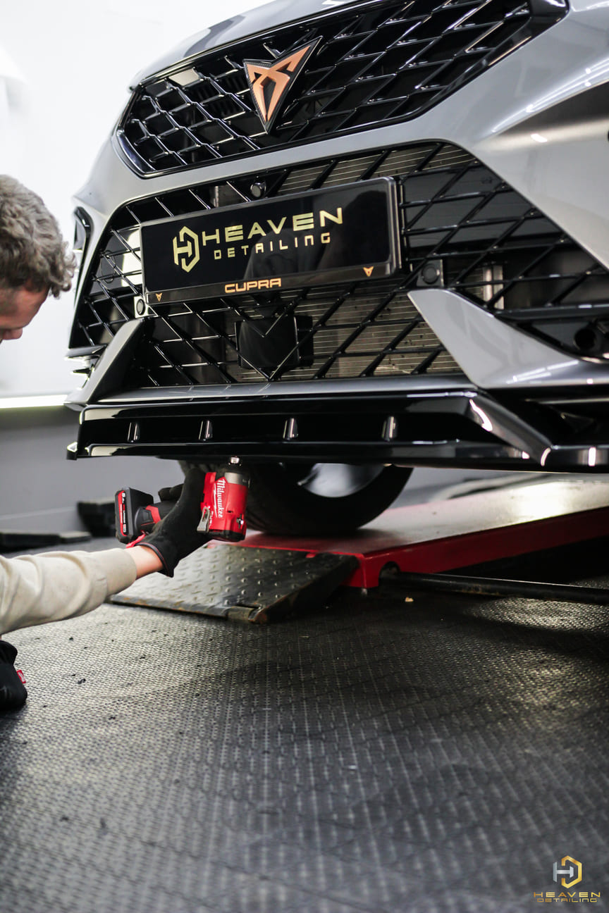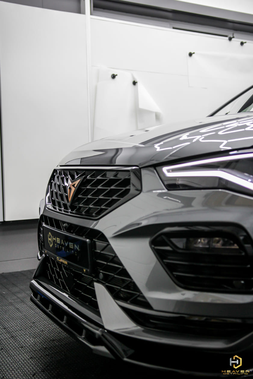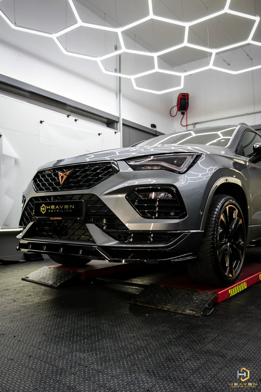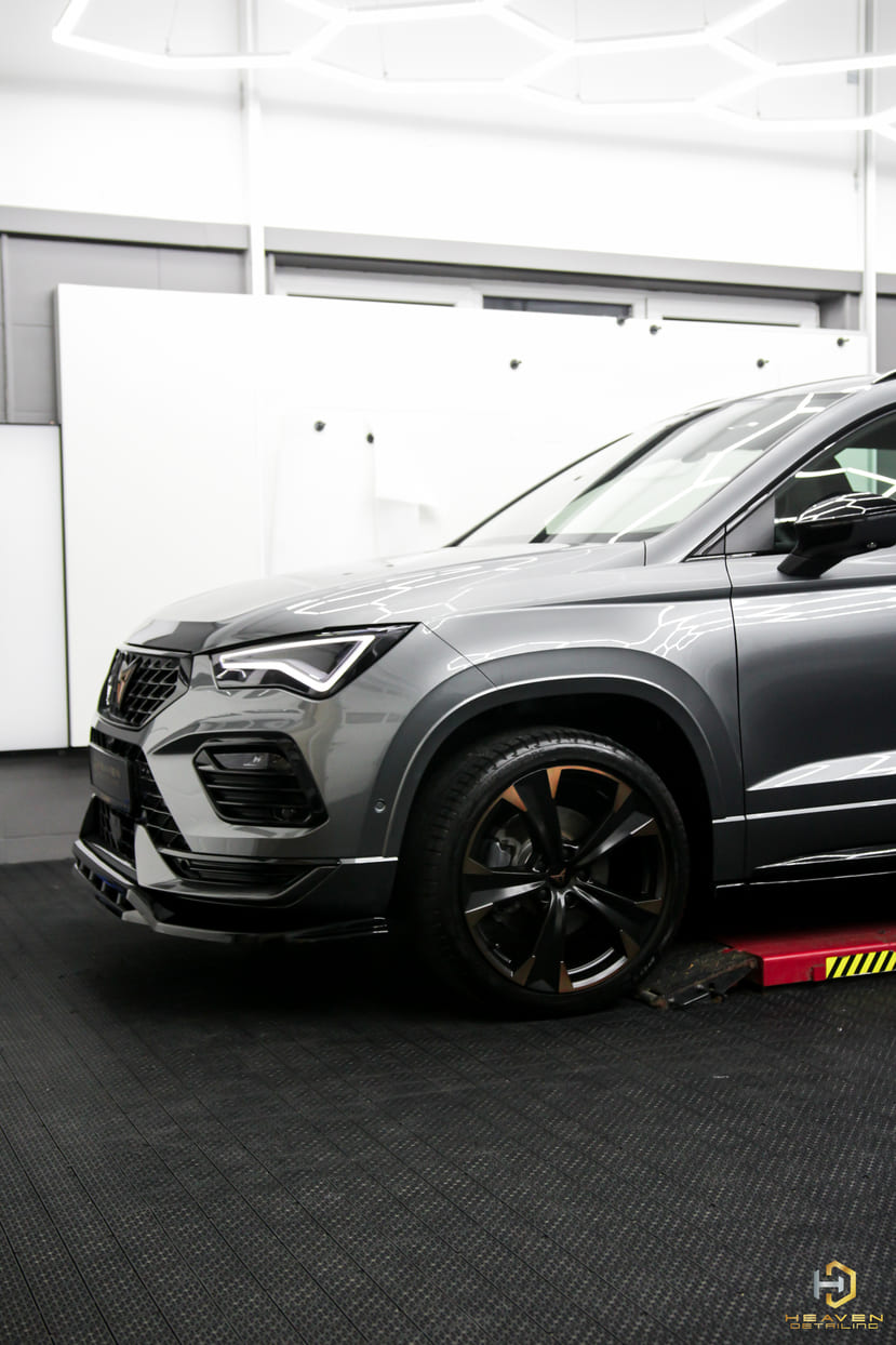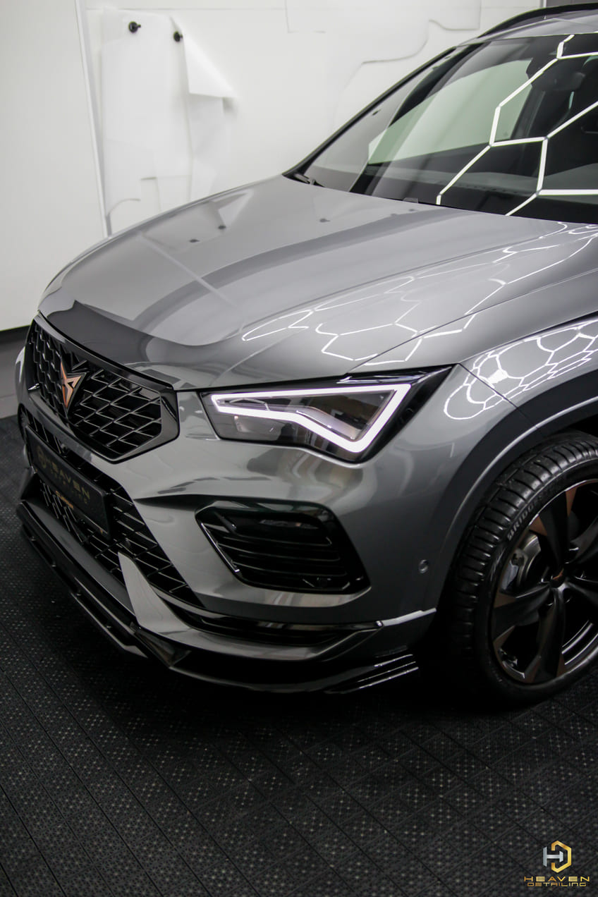 Pomimo zabezpieczenia frontu auta folią bezbarwną i reszty karoserii powłoką elastomerową, klient przy okazji pokusił się o kilka naszych propozycji odnośnie zmian wizualnych. Między innymi przyciemniliśmy delikatnie reflektory i zamontowaliśmy pakiet dokładek Maxton-Design co bardzo korzystnie wpłynęło na wizualną prezentację Cupry.